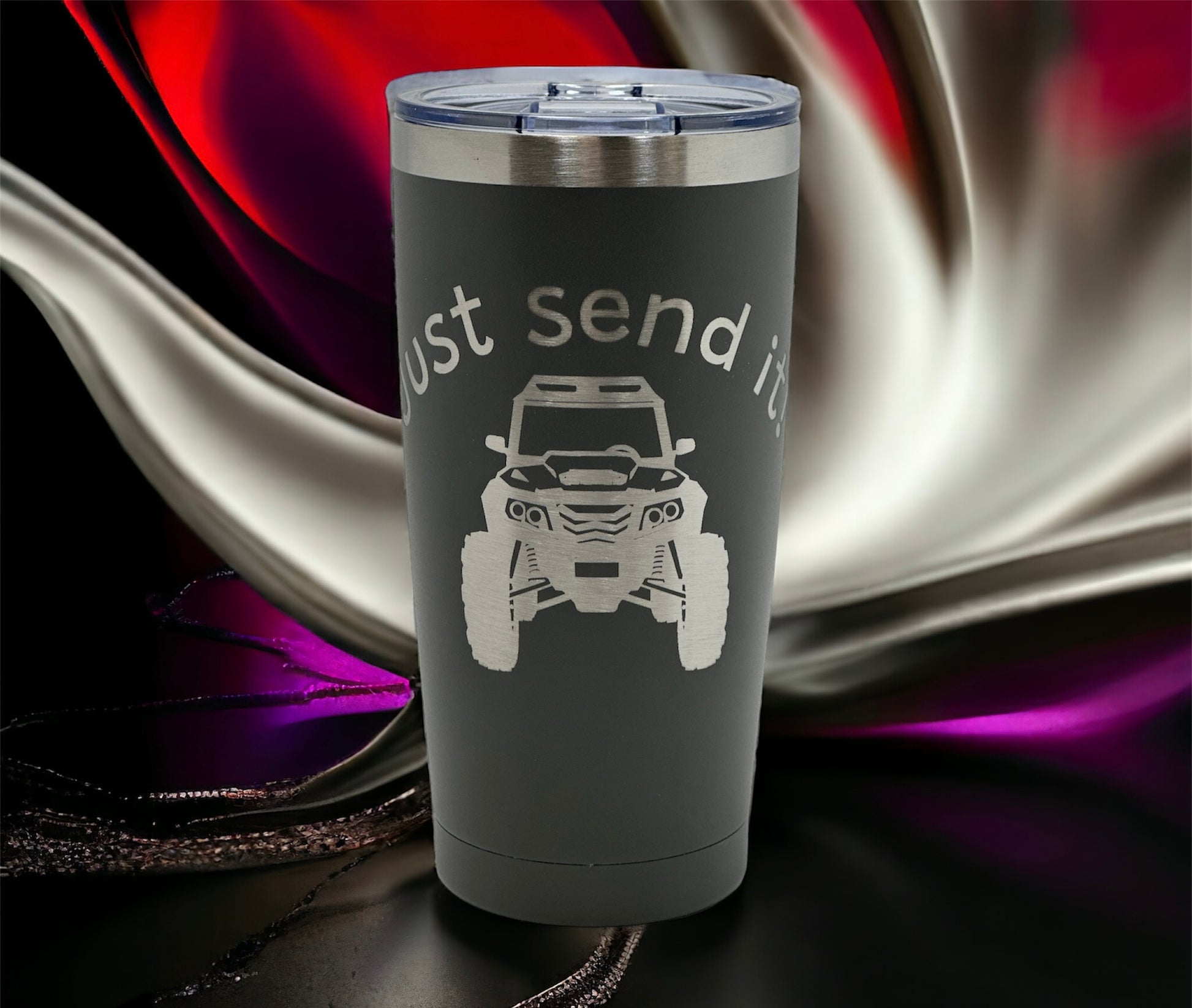 Get ready to send it with our 20oz gray tumbler! Laser engraved with "Just Send It" and accompanied by side by side adventures, this tumbler is perfect for the adventurous soul. Keep your drinks hot or cold while showing off your playful side.