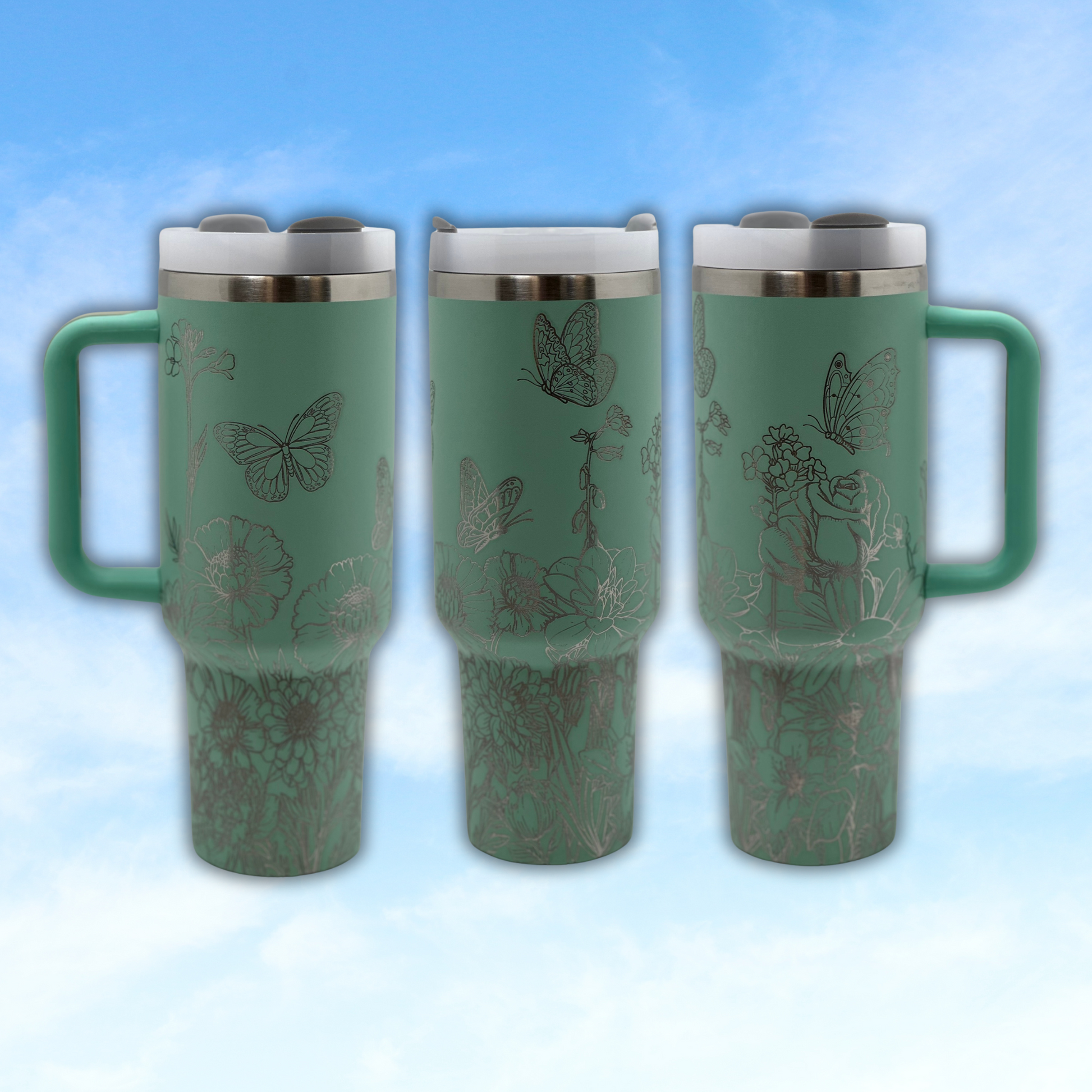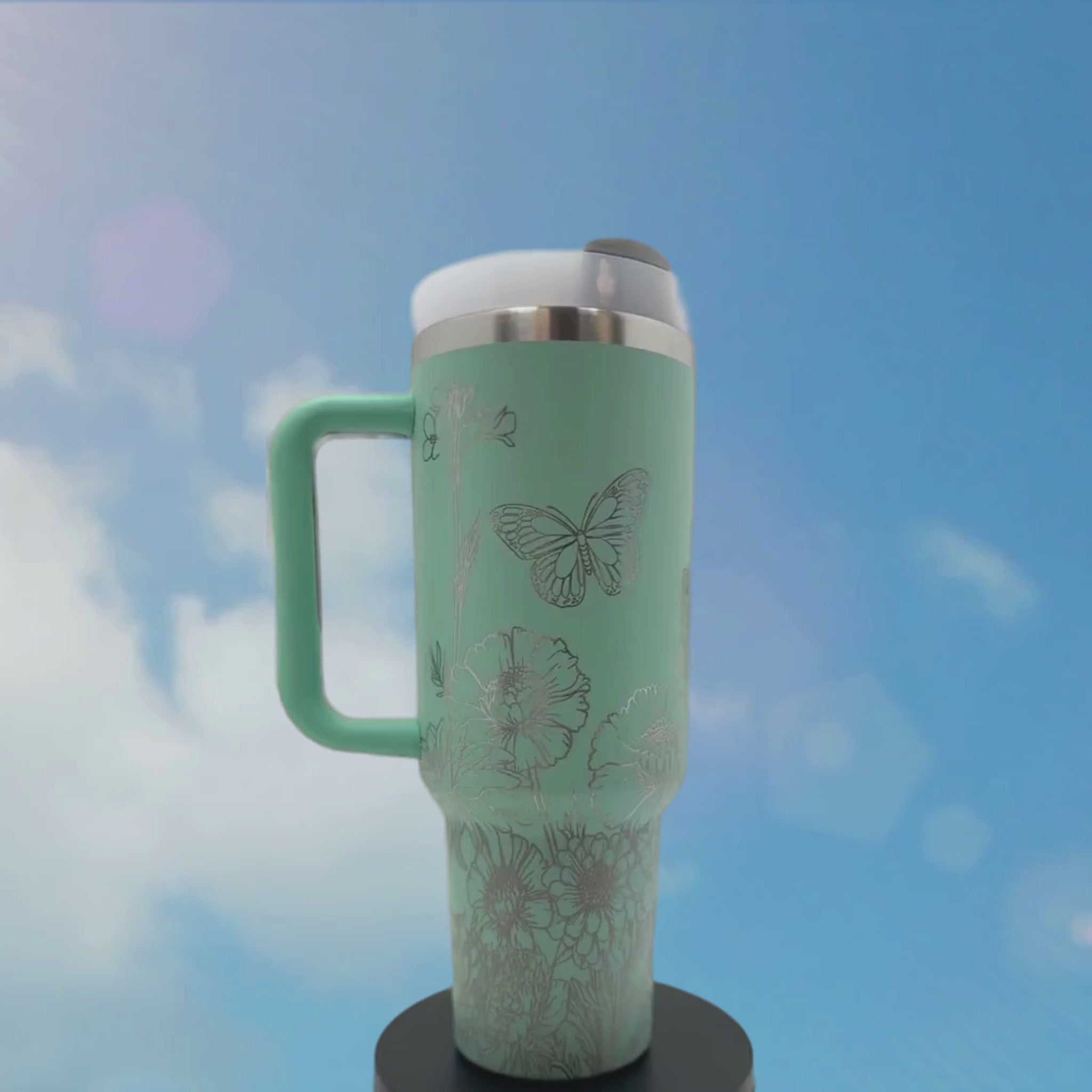 Add some whimsy to your day with our 40oz Mint Butterfly Tumbler. Perfect for keeping your drinks cold, this tumbler features charming butterfly and flower laser engravings. Comes with a handy straw for sipping on the go!