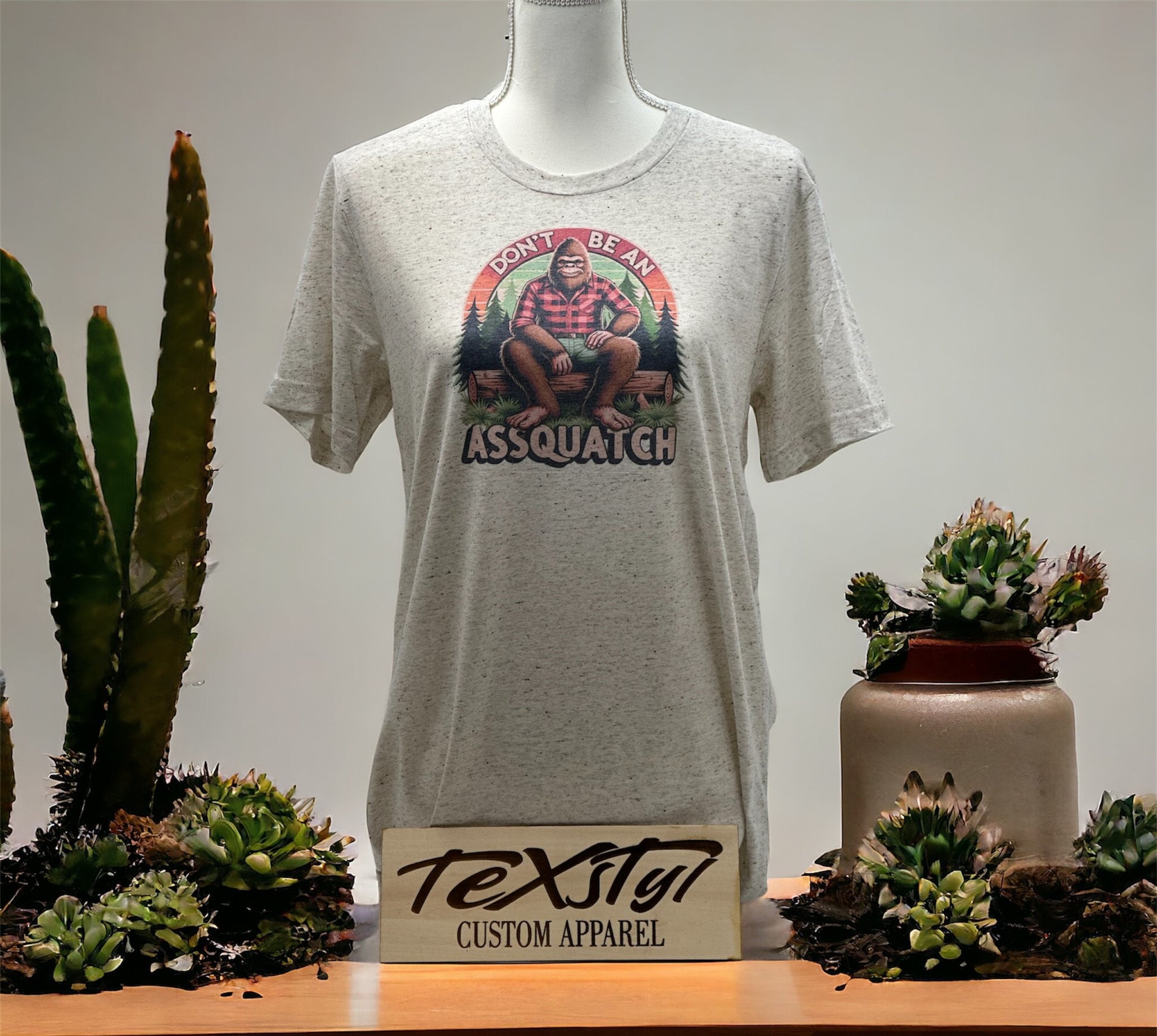 Stay comfortable and stylish with our Don't Be an Assquatch t-shirt in oatmeal. Get ready to rock this Don't Be an Assquatch T-Shirt! Printed on an oatmeal color Bella Canvas t-shirt, this tee will keep you comfortable and stylish. And with the playful yet bold phrase "Don't Be An Assquatch" printed on it, you'll be sure to stand out and make a statement.