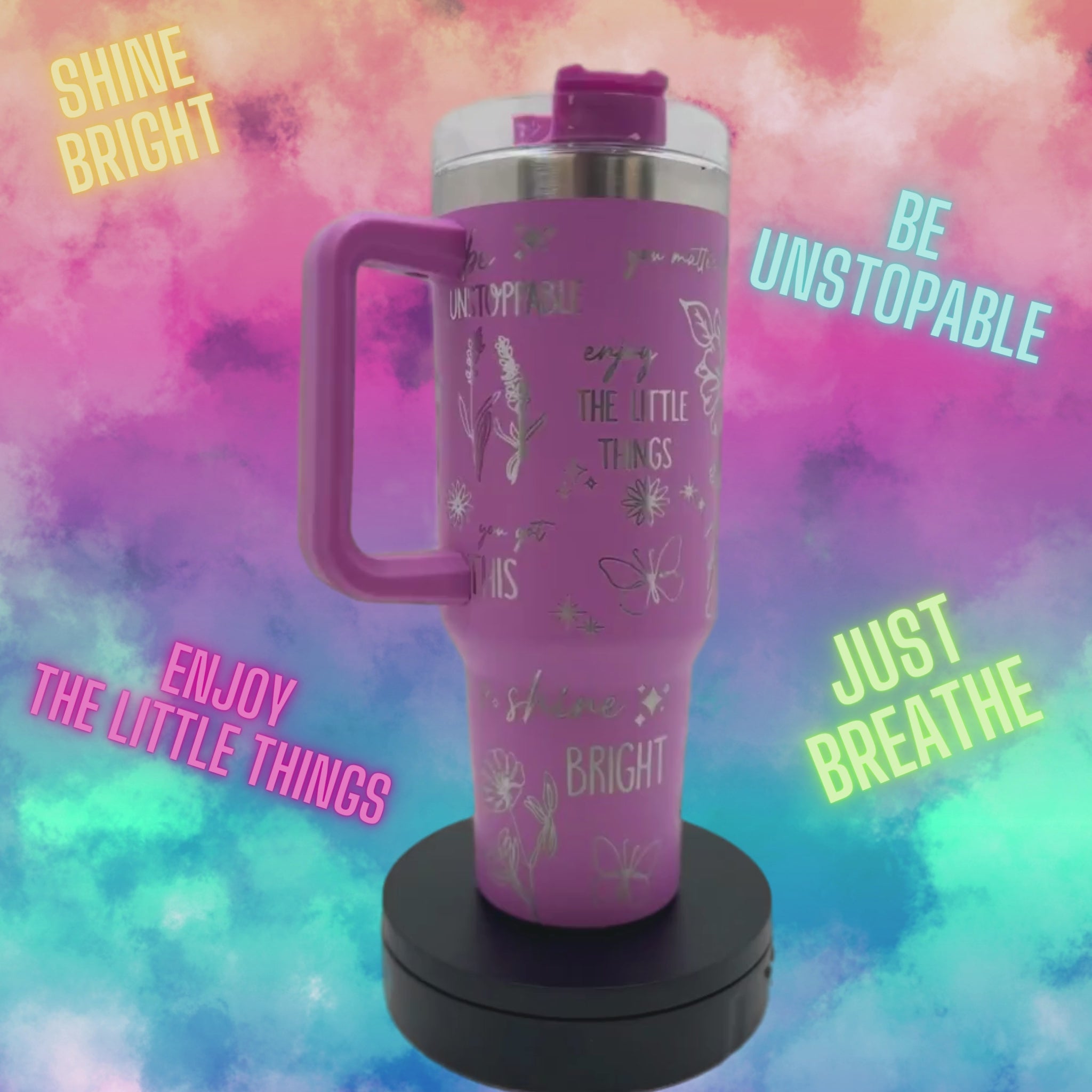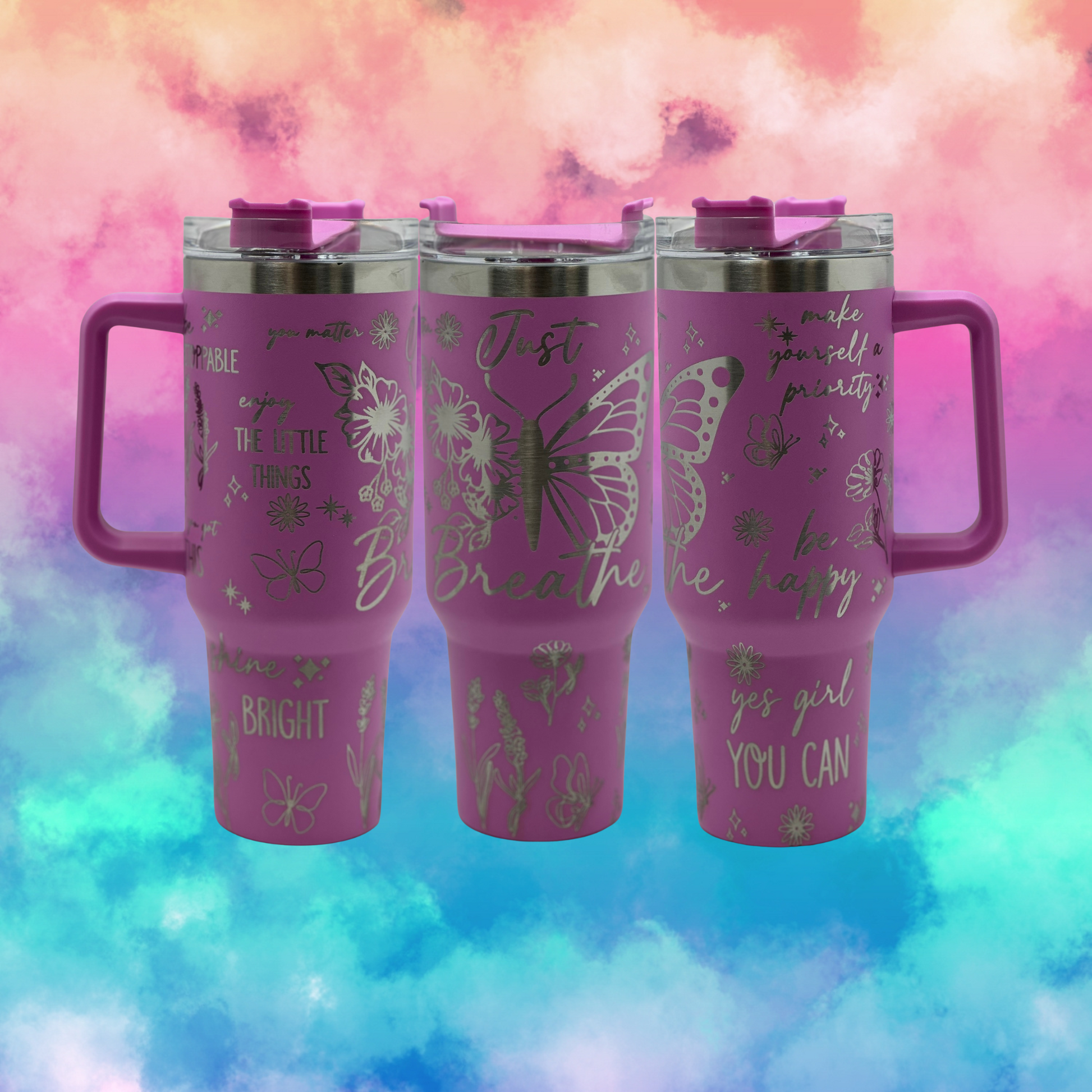 Keep your drinks cold (or hot!) in this adorable purple Just Breath Butterfly 40oz Tumbler. With laser engraved inspirational phrases and a butterfly & floral design, this tumbler is perfect for staying hydrated and motivated on the go. Fill it up and take on the day, girl!