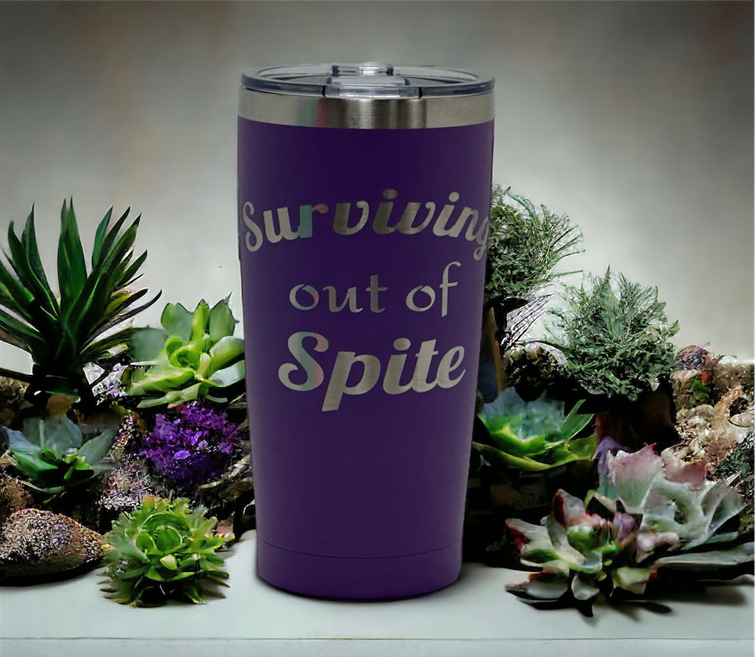 Stay hydrated and stylish with our 20oz tumbler, available in Rose Gold or Purple. With its sassy "Surviving Out of Spite" design, this tumbler is perfect for showing off your feisty attitude and keeping your drinks cold (or hot) all day long. Cheers to surviving life on your own terms!
